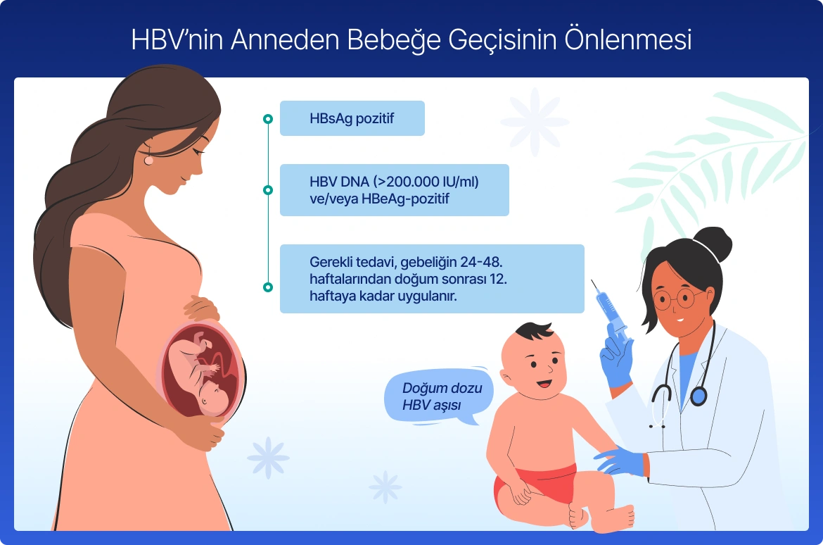 - Yüksek viral yük (HBV DNA >200.000 IU/mL) durumunda, üçüncü trimesterde antiviral tedavi başlanabilir.